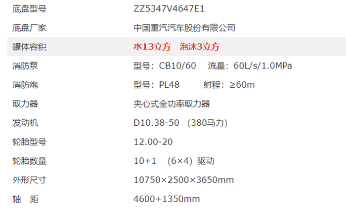 重汽豪沃16噸泡沫消防車參數配置